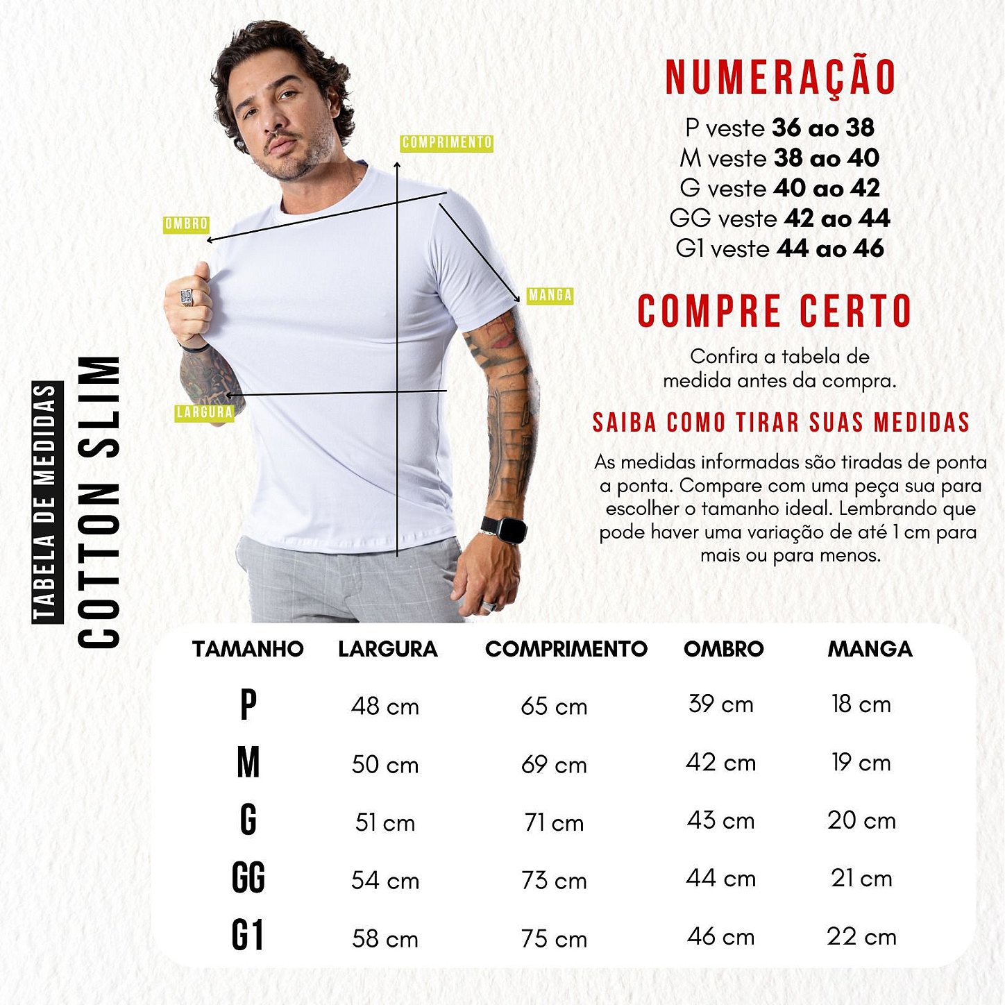 👉 Compare as medidas com alguma camiseta que você já usa e gosta.