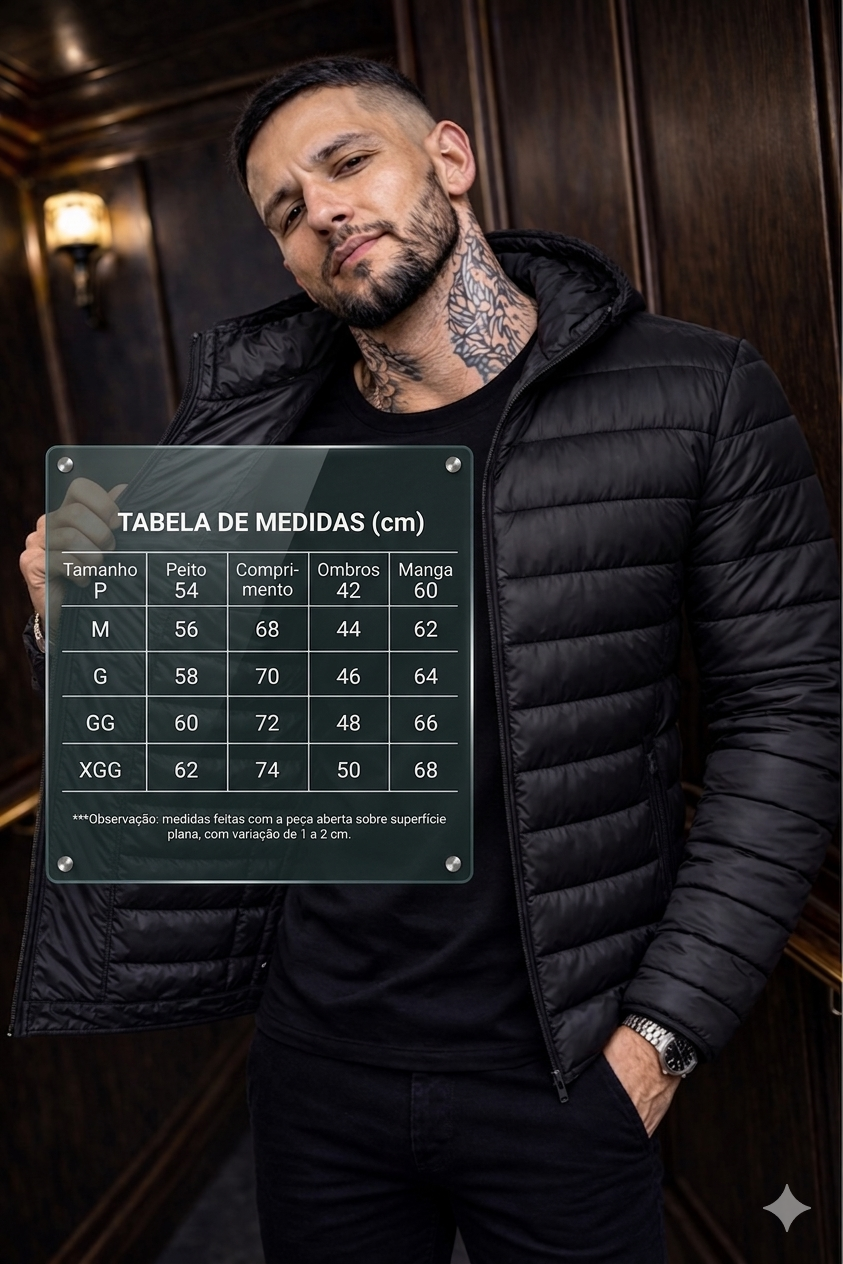 A Jaqueta Puffer Masculina Preta foi desenvolvida para quem busca proteção térmica, conforto e praticidade nos dias frios. Com visual casual e urbano, é uma peça versátil para o uso diário, trabalho, passeios, viagens e rotina de outono e inverno.