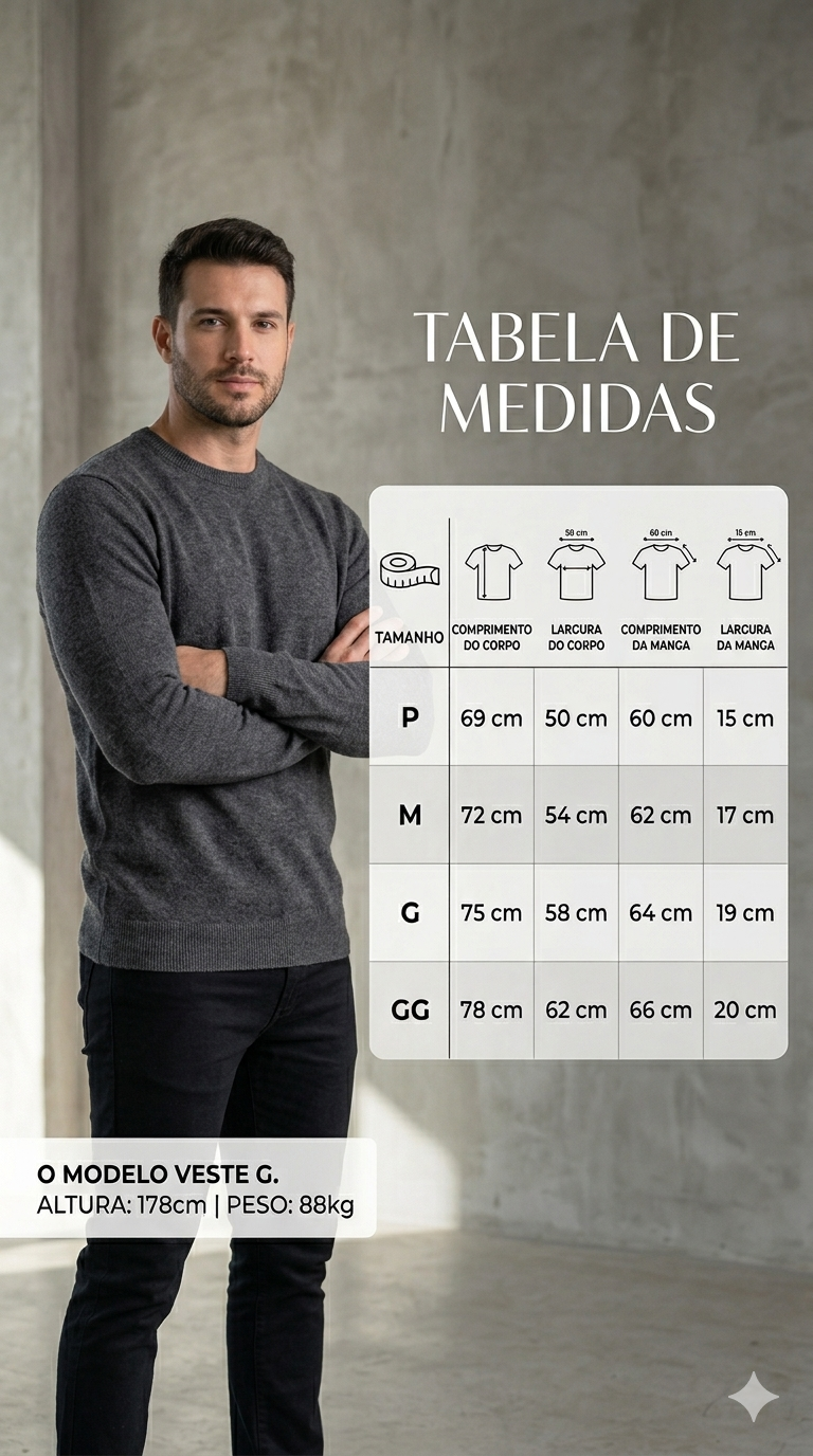 É ideal para quem procura um suéter masculino casual, prático e atemporal, com aparência limpa e ótima presença visual.